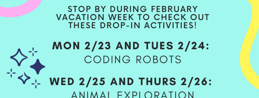 Stop in anytime on Wednesday 2/25 or Thursday 2/26 to explore antlers, bones, nests, and more from NH animals! Don’t miss the Animal Tracks program at 1pm on Wednesday 2/25 with Prescott Farm!