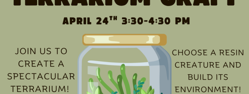 Build a tiny terrarium habitat for a resin animal! Registration is appreciated, please email cbeihl.hl@gmail.com to sign up.  For youth in grades 5+.