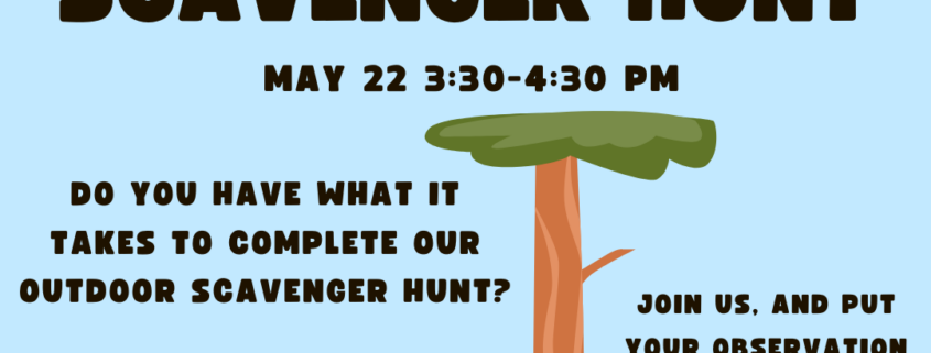 Do you have what it takes to complete our outdoor scavenger hunt? Join us and put your observation skills to the test! For youth in grades 5+, no registration needed.