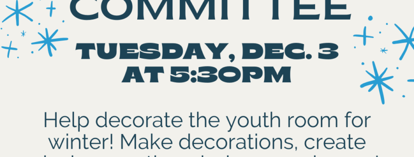 Help decorate the youth room for winter! Make decorations, create designs on the windows, and more! Youth in grades 5 and up are welcome to join. Snacks are provided.