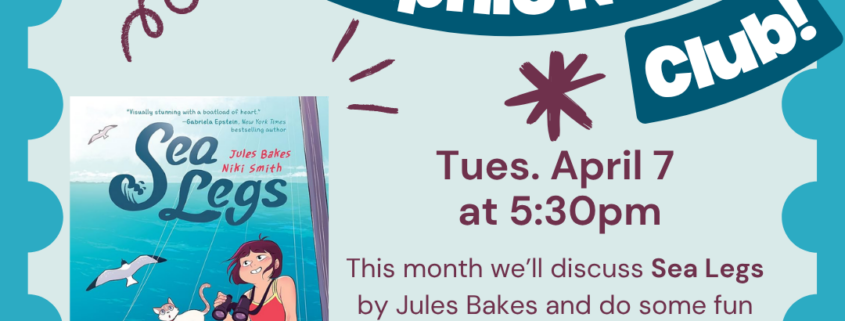 Join us for some book club fun! We’ll be discussing Sea Legs by Jules Bakes. Copies available at the library.