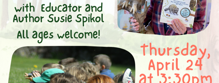 We are so excited to welcome author and nature educator Susie Spikol for a great nature program on April 24th after school! From her website: “Join award-winning naturalist and author Susie and learn the art and skills of becoming an animal adventurer! Sharpen your observation skills through games and activities that will prepare you for a lifetime of wildlife experiences! Hear how watching wild animals, no matter where you live, can help you feel more connected to the natural world and each other and deepen your scientific understanding of everyday nature.“