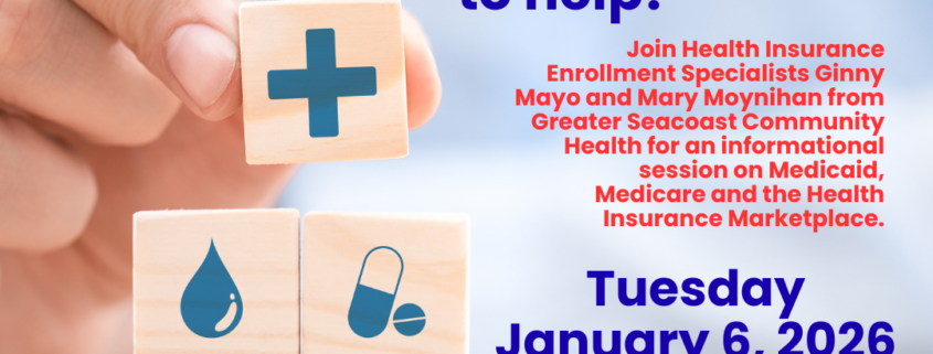 Join Health Insurance Enrollment Specialists Ginny Mayo and Mary Moynihan from Greater Seacoast Community Health for an informational session on Medicaid, Medicare and the Health Insurance Marketplace.