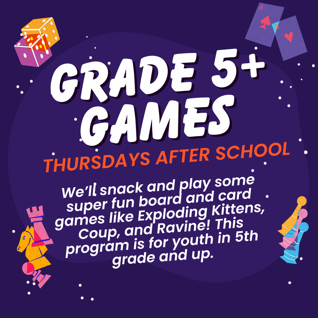 Join us for some fun games and snacks! All youth in grades 5 and up are welcome. No registration needed.