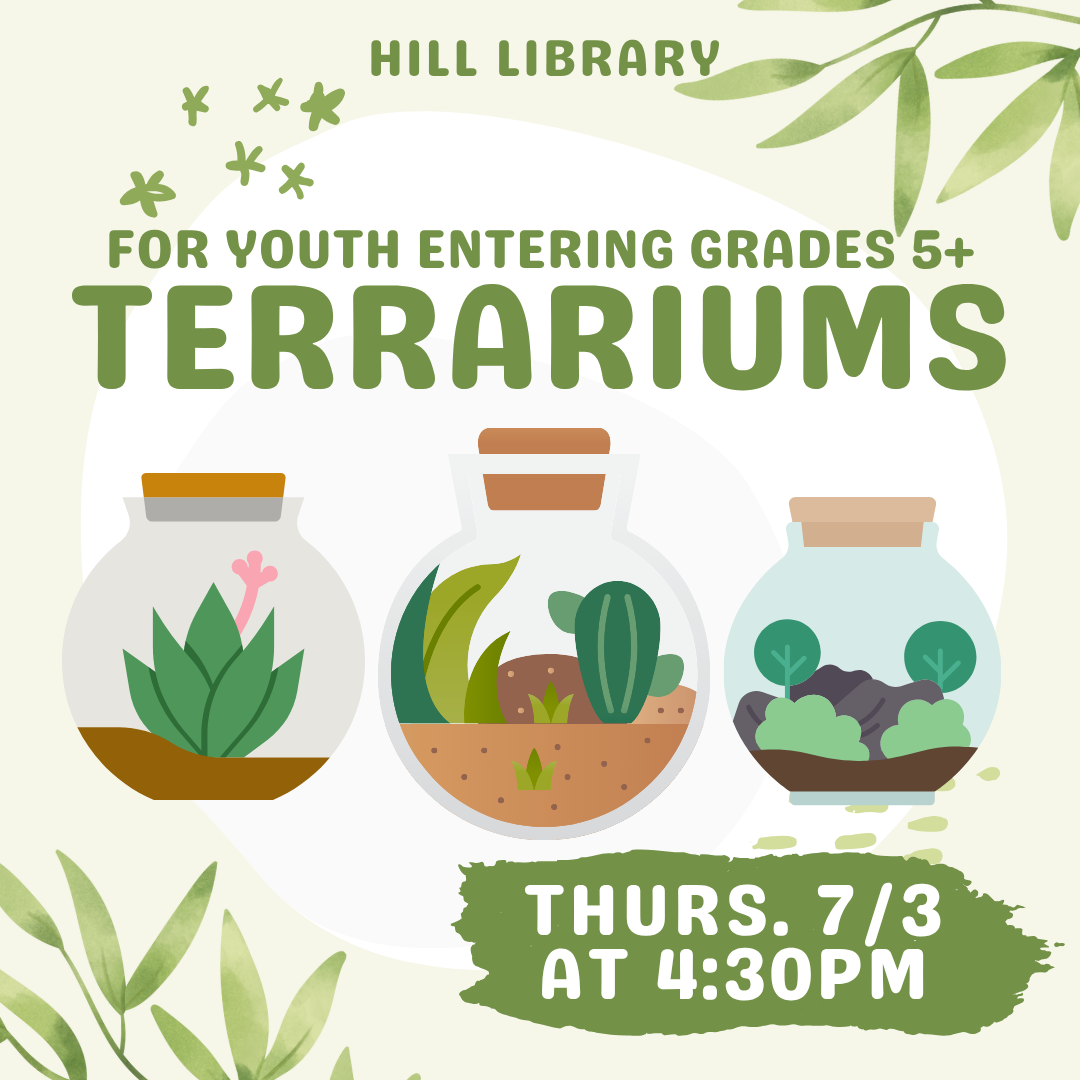 Make a super cute DIY terrarium! This program is for youth entering grades 5+. No registration needed.