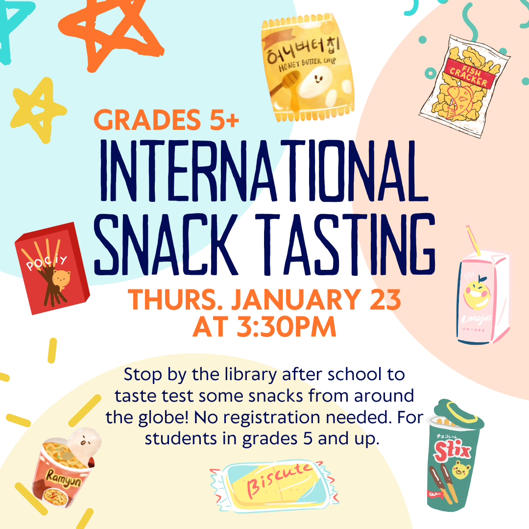Join us for a trip around the world in food! We'll try a tasty and interesting assortment of foods and give each a rating. No registration needed. This program is for youth in grades 5 and up.