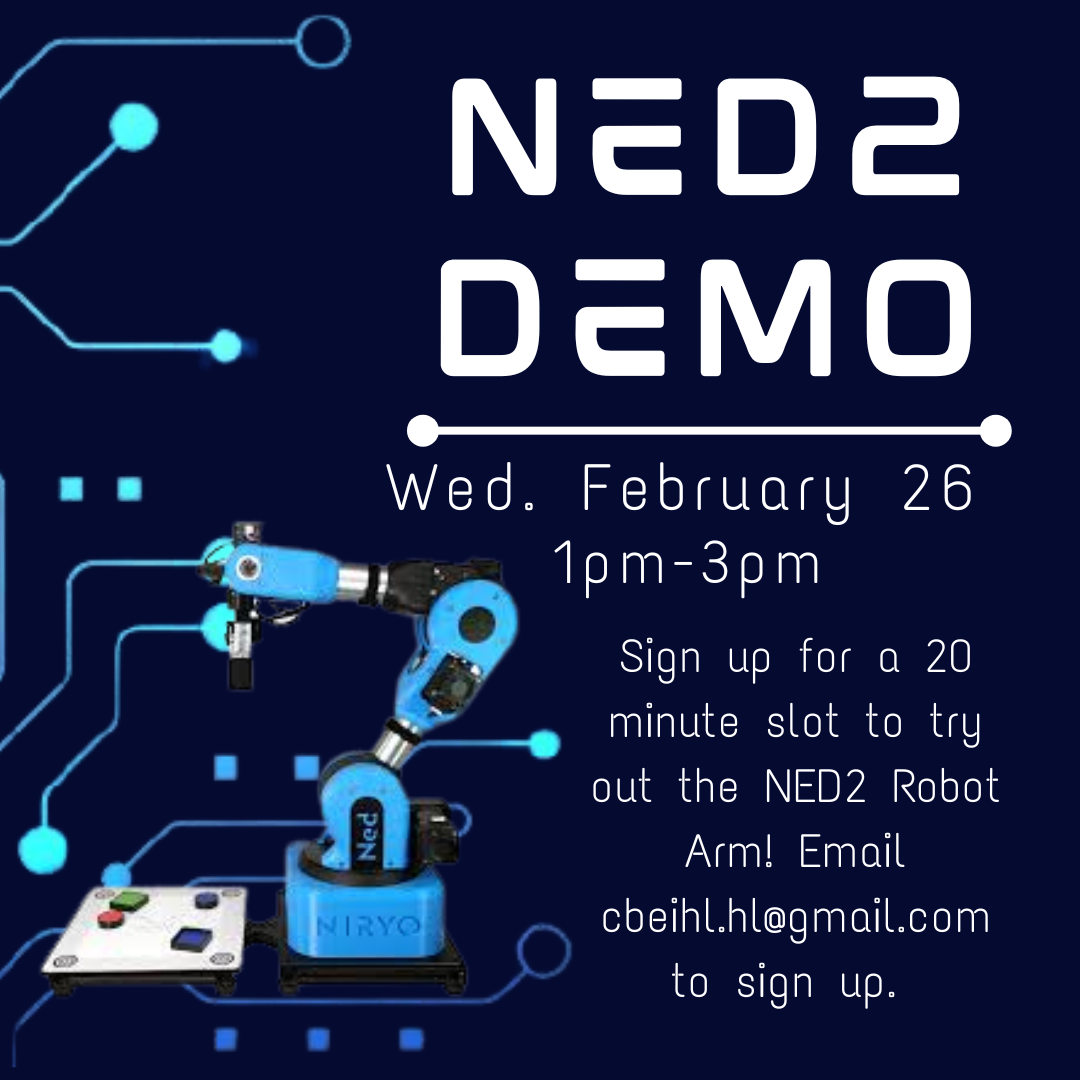 Try out the NED2 robotic arm! To sign up for a 20 minute time slot, email cbeihl.hl@gmail.com.