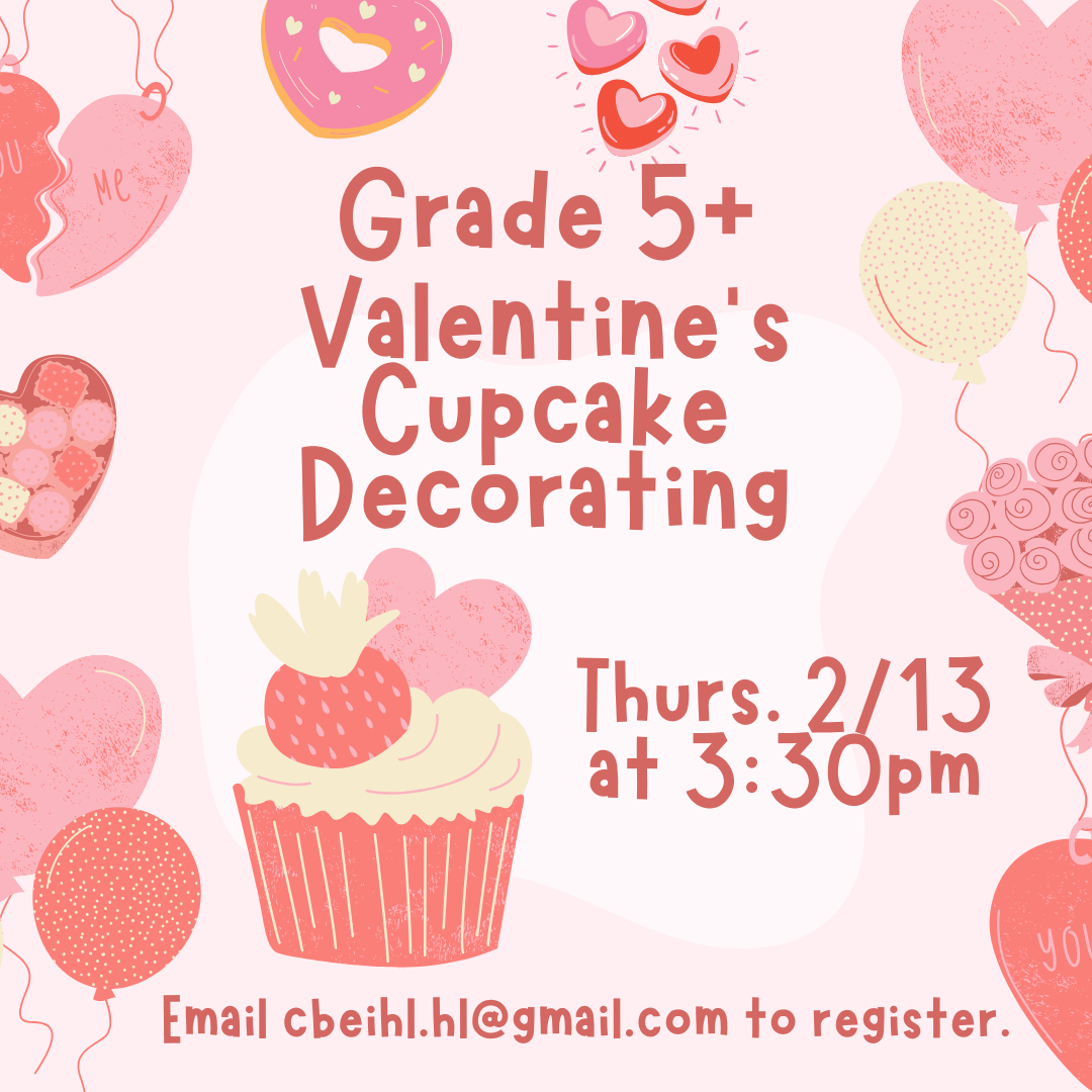 Decorate tasty Valentine's Day cupcakes! Email cbeihl.hl@gmail.com to register. This program is for youth in grades 5 and up.