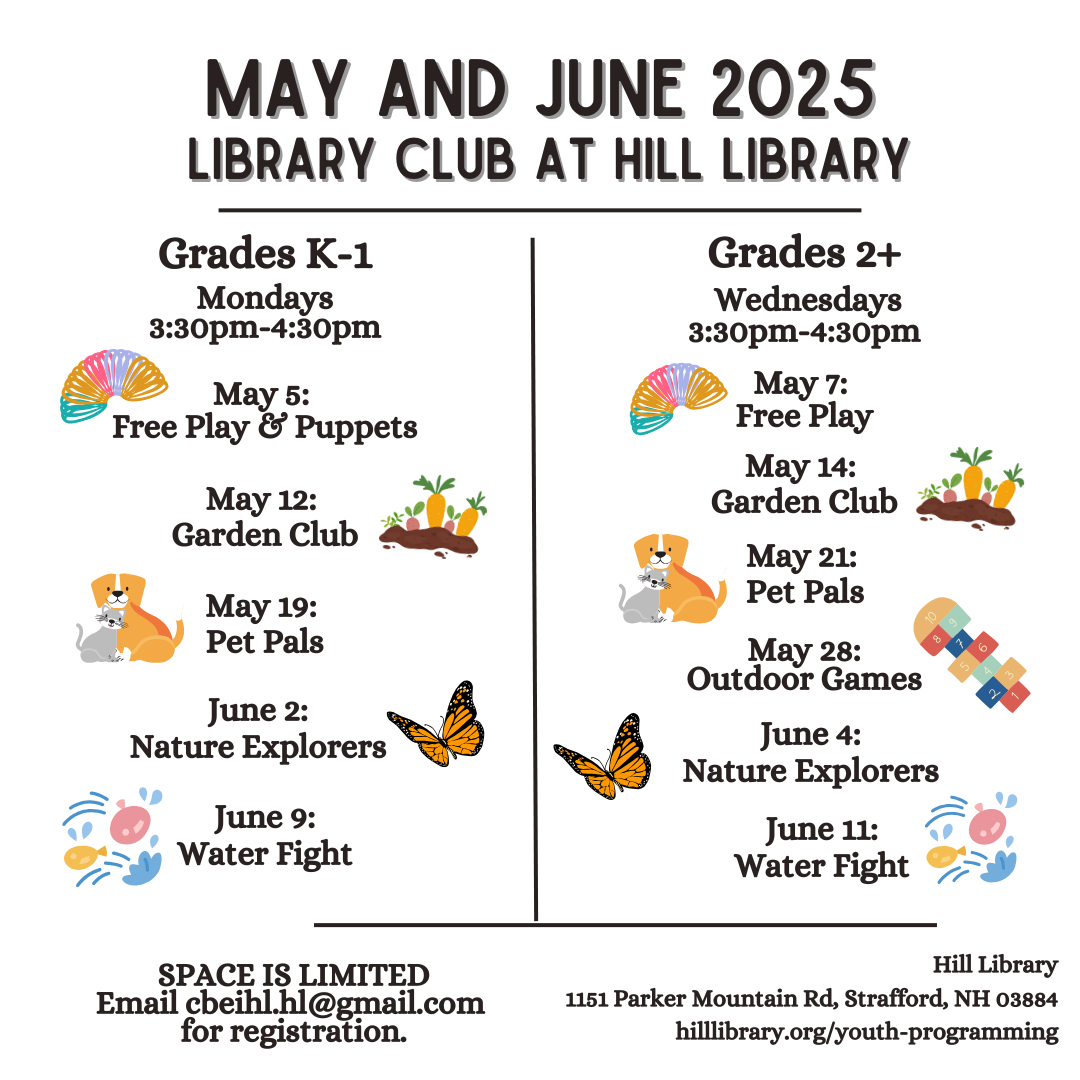 Hill Library 1151 Parker Mountain Road, Strafford, NHMay-June registration is open. Email cbeihl.hl@gmail.com to get the registration links, or be added to the Library Club email list for future sign-ups. Library Club Grades K-1 May 5: Free Play & Puppets May 12: Garden Club May 19: Pet Pals June 2: Nature Explorers June 9: Water Fight Library Club Grades 2+ May 7: Free Play May 14: Garden Club May […]
