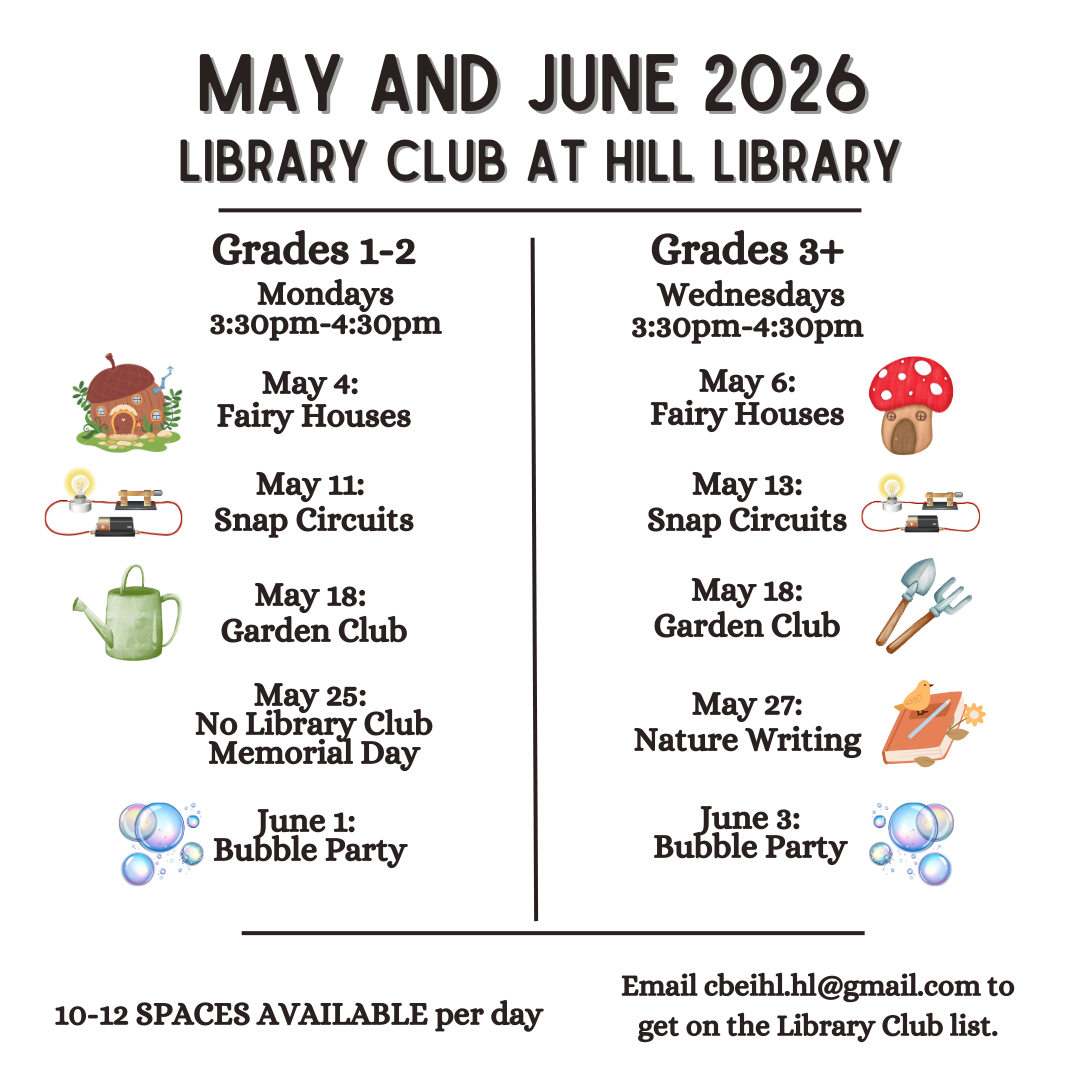 Email cbeihl.hl@gmail.com to get the registration links, or be added to the Library Club email list for future sign-ups.