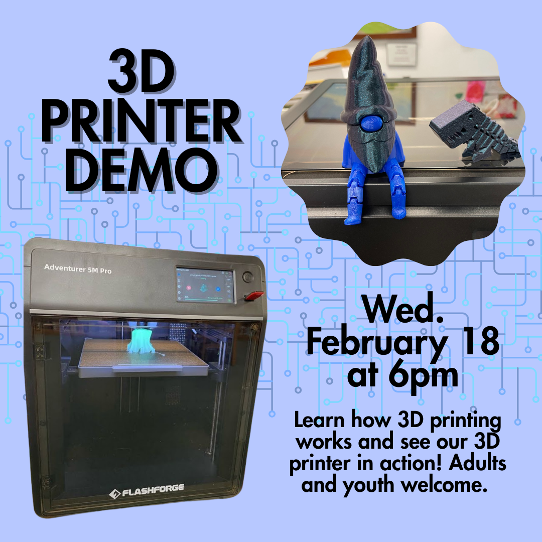 Learn how 3D printing works and watch a demo of the library’s new 3D printer, made possible by the NH Charitable Foundation's technology grant! Adults and youth welcome. |