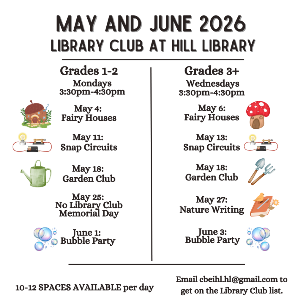 Hill Library Youth Services aims to enrich the growth and education of each young reader who visits. Read below to learn more about our Story Time offerings, Library Club, and other Youth Events!